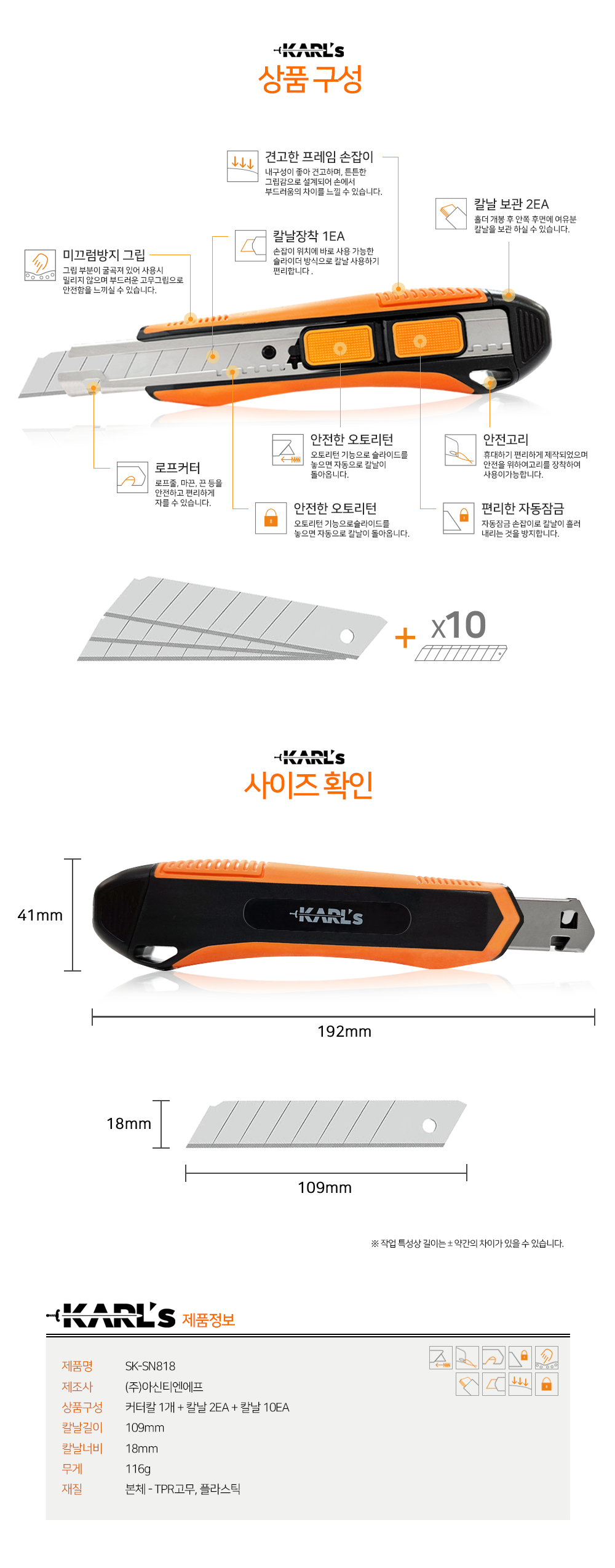 칼스 고무그립 자동리턴 안전 커터칼 18mm